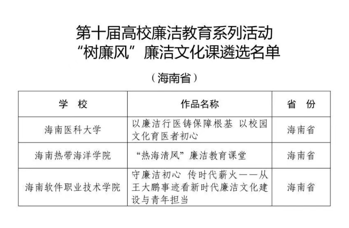 下一步,我校将以此次入选为契机,持续深耕廉洁文化建设,充分发挥优秀作品的示范引领作用,进一步挖掘廉洁教育资源、创新教育形式、提升教育实效,让廉洁教育走深走实、入脑入心,引导广大师生将廉洁素养内化为精神追求、外化为行动自觉,持续营造风清气正的校园政治生态和育人环境,为建设国内一流海洋大学、助力清廉自贸港建设注入源源不断的“廉动力”。