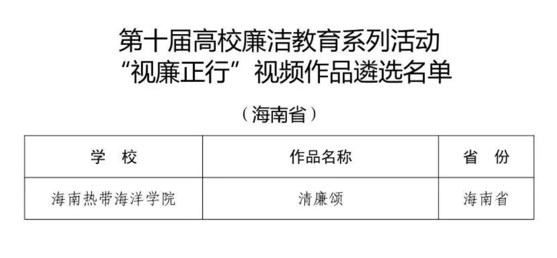 下一步,我校将以此次入选为契机,持续深耕廉洁文化建设,充分发挥优秀作品的示范引领作用,进一步挖掘廉洁教育资源、创新教育形式、提升教育实效,让廉洁教育走深走实、入脑入心,引导广大师生将廉洁素养内化为精神追求、外化为行动自觉,持续营造风清气正的校园政治生态和育人环境,为建设国内一流海洋大学、助力清廉自贸港建设注入源源不断的“廉动力”。